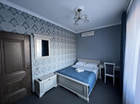 Просторий номер, оснащений всіма необхідними для комфортного проживання приладами. Розмір номера 20 м² 1 широке двоспальне ліжко. Вид на внутрішній двір